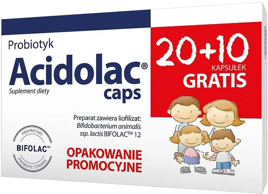 Acidolac® caps to suplement diety w formie kapsułek, zawierający liofilizowane kultury bakterii kwasu mlekowego Bifidobacterium animalis ssp. lactis BIFOLACTM 12. Produkt przeznaczony jest dla dzieci powyżej 6. roku życia oraz dorosłych, którzy chcą w prosty sposób uzupełnić codzienną dietę w bakterie kolonizujące jelita. Preparat można stosować w trakcie i po antybiotykoterapii, a także w czasie podróży związanych ze zmianą strefy klimatycznej, kiedy to skład mikroflory jelitowej może ulec przejściowym zmianom. Dzięki wygodnej formie kapsułek oraz możliwości podania zawartości z wodą, jogurtem lub mlekiem, suplement dopasowuje się do różnych potrzeb użytkowników.