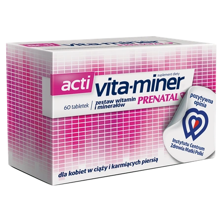 Produkt Acti Vita-miner Prenatal opracowany został dla kobiet ciężarnych, planujących ciążę i karmiących piersią. Suplementuje codzienną dietę w składniki niezbędne do prawidłowego funkcjonowania organizmu, zwłaszcza w tych szczególnych i wymagających okresach. Preparat stanowi odpowiednio dobraną, zbilansowaną kompozycję witamin i minerałów, która zapobiega powstawaniu niedoborów oraz wspiera właściwy przebieg ciąży i rozwój płodu (zwłaszcza wyższa porcja kwasu foliowego).