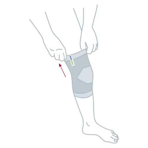 Wsunąć stopę w rękaw opaski, trzymając ją etykietą pielęgnacyjną skierowaną do góry. Naciągnąć opaskę na kolano i dopasować górną część do dolnej części uda tak, aby strefa elastyczna obejmowała kolano i zapewniała komfort podczas ruchu.