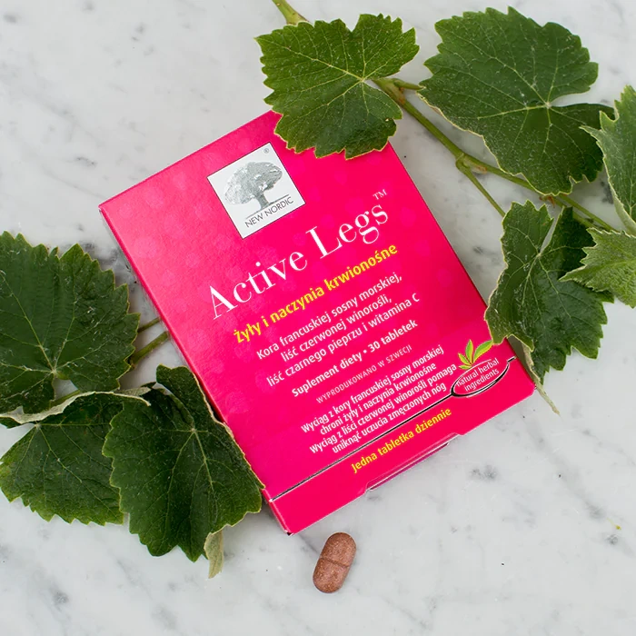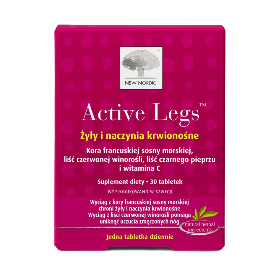 Active Legs to suplement diety opracowany dla osób, które chcą zadbać o dobrą kondycję żył oraz przeciwdziałać uczuciu ciężkich, zmęczonych nóg – zwłaszcza po długotrwałym staniu lub siedzeniu. Formuła łączy ekstrakt z kory francuskiej sosny morskiej, wyciąg z liści czerwonej winorośli i czarny pieprz oraz witaminę C, która pomaga w prawidłowym tworzeniu kolagenu i wspiera prawidłowe funkcjonowanie naczyń krwionośnych. Produkt powstaje w Szwecji, zgodnie z wysokimi standardami jakości.