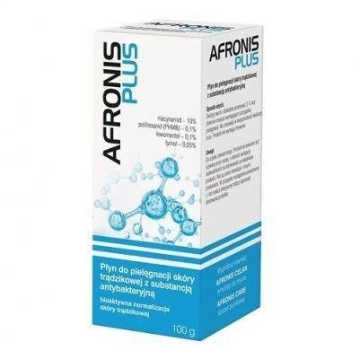 Produkt kosmetyczny Afronis Plus jest przezroczystym bezbarwnym płynem do stosowania na skórę. Pakowanym w butelkę ze szkła brunatnego z zakrętką z kroplomierzem w tekturowym pudełku. Dostępne są opakowania po 100 g.