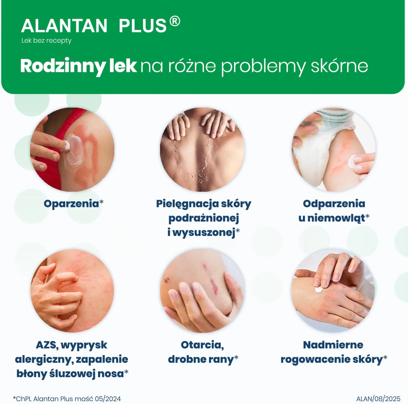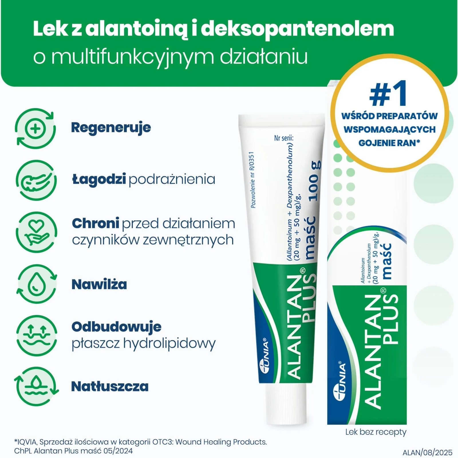Alantan Plus to żółtawa, jednorodna maść do stosowania miejscowego, która łączy alantoinę (20 mg/g) i deksopantenol (50 mg/g), aby skutecznie łagodzić podrażnienia, przyspieszać regenerację oraz nawilżać i zmiękczać skórę. Preparat sprawdzi się w pielęgnacji skóry wymagającej ukojenia – od odleżeń pieluszkowych u niemowląt, przez otarcia, niewielkie skaleczenia, pęknięcia naskórka, po oparzenia słoneczne (także po radioterapii i fototerapii), nadmierne rogowacenie dłoni i stóp, a nawet podrażnioną, przesuszoną skórę dorosłych. Dzięki połączeniu substancji aktywnych o komplementarnym działaniu oraz bazie ochronnej z lanoliną, preparat tworzy na skórze film wspierający naturalne procesy naprawcze i ogranicza utratę wody.