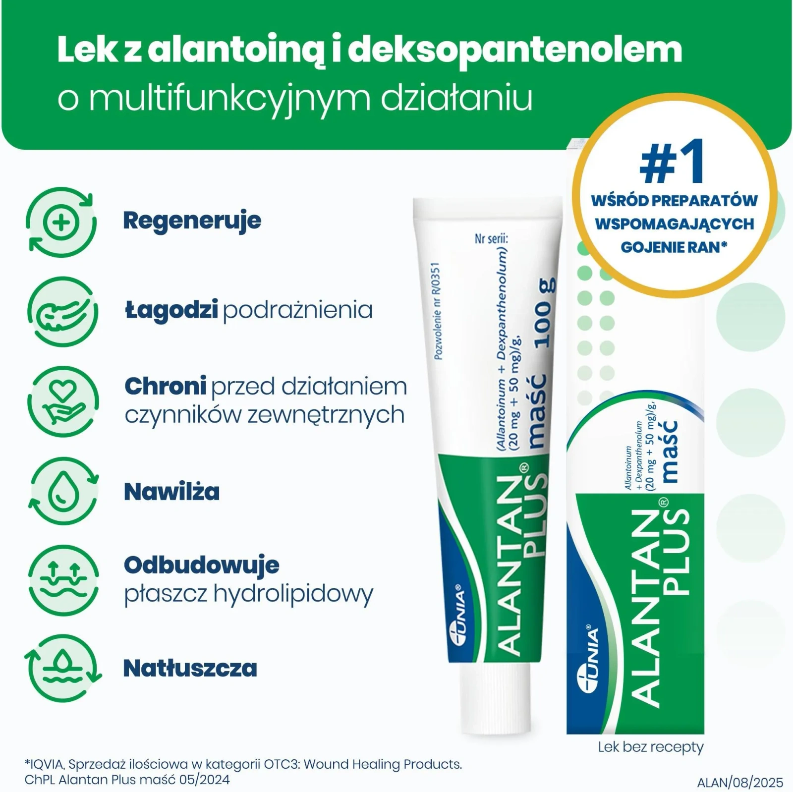 Alantan Plus to żółtawa, jednorodna maść do stosowania miejscowego, która łączy alantoinę (20 mg/g) i deksopantenol (50 mg/g), aby skutecznie łagodzić podrażnienia, przyspieszać regenerację oraz nawilżać i zmiękczać skórę. Preparat sprawdzi się w pielęgnacji skóry wymagającej ukojenia – od odleżeń pieluszkowych u niemowląt, przez otarcia, niewielkie skaleczenia, pęknięcia naskórka, po oparzenia słoneczne (także po radioterapii i fototerapii), nadmierne rogowacenie dłoni i stóp, a nawet podrażnioną, przesuszoną skórę dorosłych. Dzięki połączeniu substancji aktywnych o komplementarnym działaniu oraz bazie ochronnej z lanoliną, preparat tworzy na skórze film wspierający naturalne procesy naprawcze i ogranicza utratę wody.