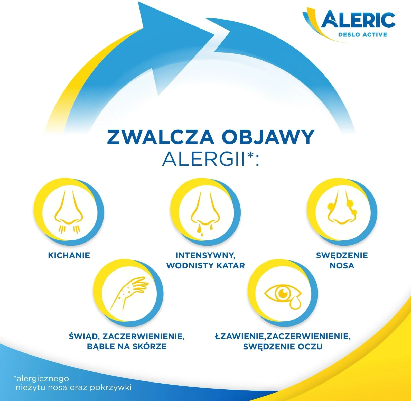 Aleric Deslo Active ułatwia kontrolę reakcji alergicznej, nie wywołując przy tym senności. Substancją czynną leku jest desloratadyna, która selektywnie blokuje receptory H1 dla histaminy, dzięki czemu zwalcza objawy uczulenia, m.in.: kichanie, wyciek z nosa, świąd, obrzęk, wysypkę, pieczenie i łzawienie oczu, zaczerwienienie skóry, pokrzywkę.