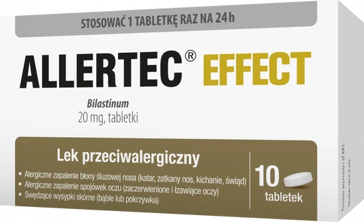 Alergia potrafi skutecznie utrudnić codzienne funkcjonowanie – uporczywy katar, kichanie, swędzenie oczu czy zmiany skórne obniżają komfort życia i koncentrację. Allertec Effect 20 mg to nowoczesny lek przeciwhistaminowy z bilastyną, który pomaga szybko i skutecznie złagodzić objawy alergii sezonowej oraz całorocznej. Preparat działa nawet do 24 godzin po przyjęciu jednej tabletki, nie wykazując właściwości uspokajających, dzięki czemu może być stosowany w ciągu dnia – także przez osoby aktywne zawodowo. Allertec Effect to wygodne rozwiązanie dla dorosłych i młodzieży od 12. roku życia, którzy szukają długotrwałej ochrony przed objawami alergii.