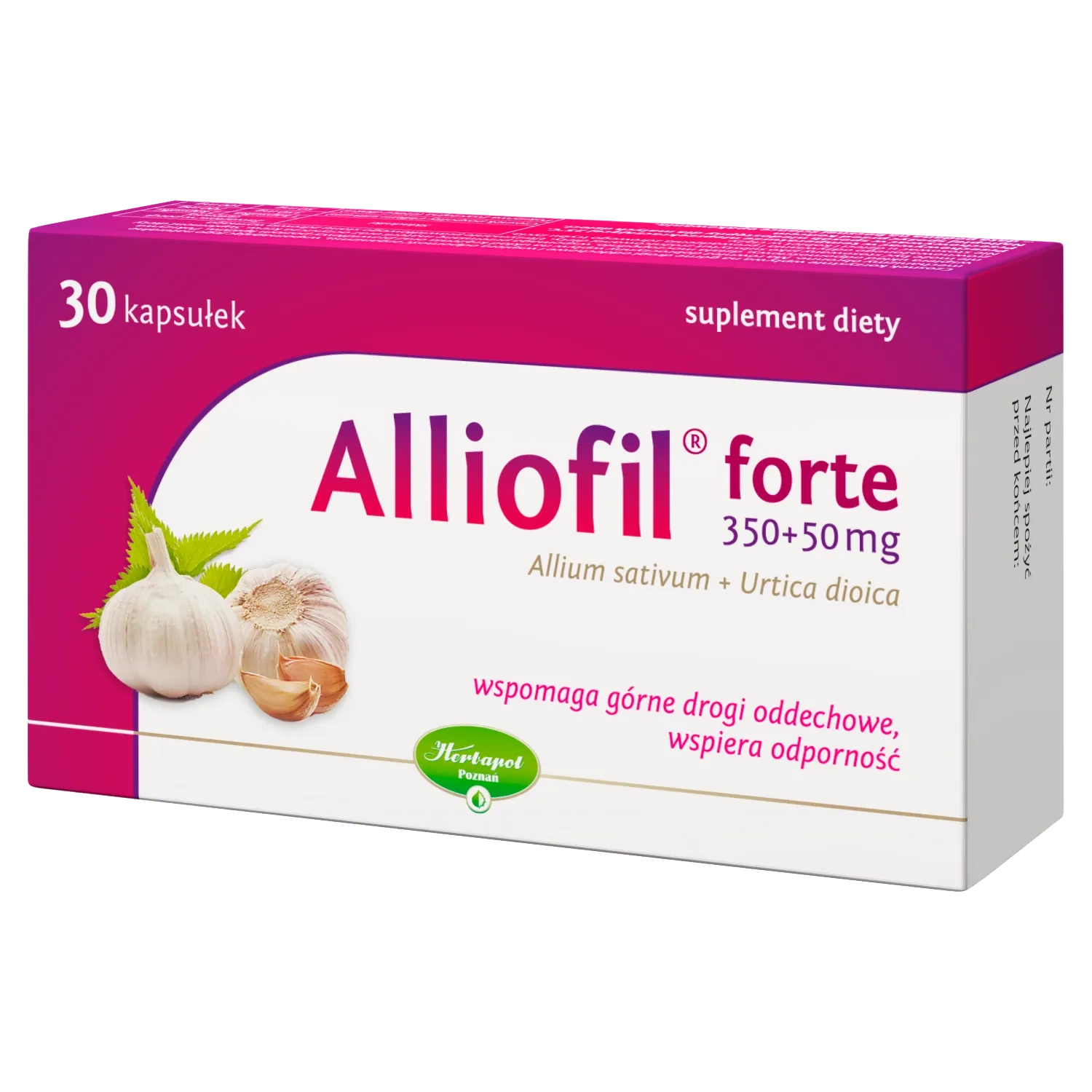 Alliofil Forte to duet substancji roślinnych, tradycyjnie wykorzystywanych w zapobieganiu oraz łagodzeniu objawów infekcji górnych dróg oddechowych. Posiada właściwości przeciwbakteryjne i przeciwwirusowe, wspomaga regenerację błony śluzowej jamy ustnej i gardła oraz nasila usuwanie prekursorów gorączki (tzw. pirogenów) wraz z moczem.