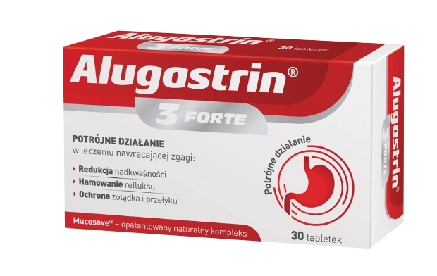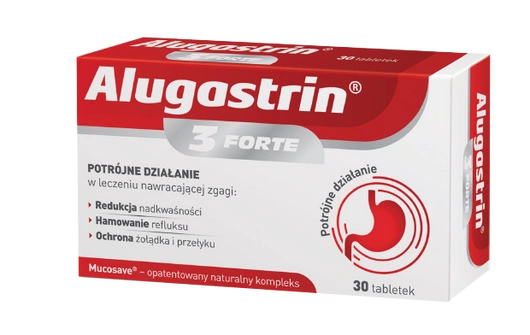 - ALUGASTRIN 3 FORTE, 30 tabletek to preparat łagodzący objawy nadkwaśności żołądka, zgagi i refluksu. Wspomaga ochronę błony śluzowej żołądka.