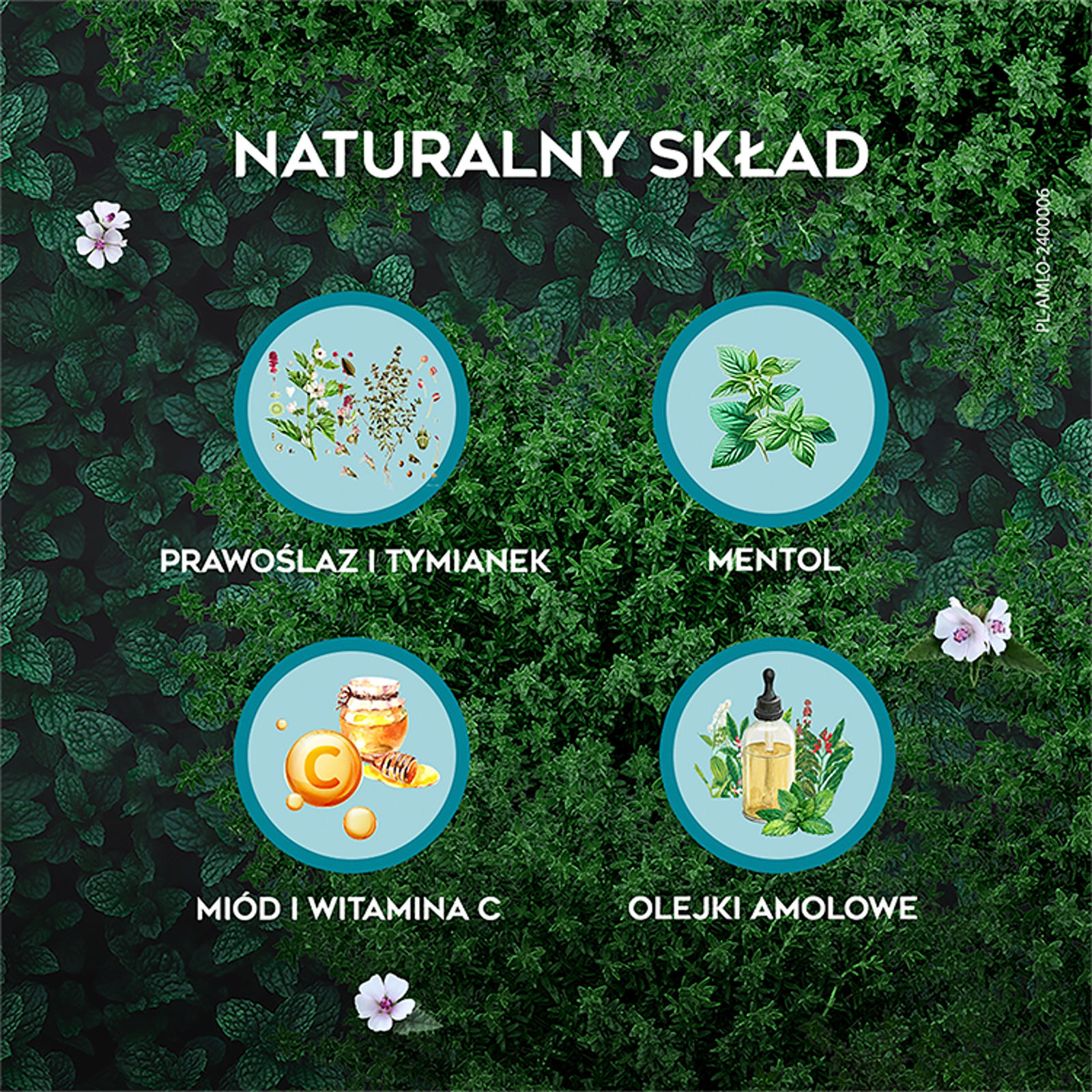 Amolowe na gardło z miodem i witaminą C to suplement diety w formie pastylek do ssania, które łączą tradycyjne składniki roślinne – prawoślaz, tymianek i mentol – znane ze swojej naturalnej zdolności do łagodzenia podrażnienia gardła, nawilżania błony śluzowej i wspierania komfortu podczas połykania. Dodatek miodu oraz witaminy C, która pomaga w prawidłowym funkcjonowaniu układu odpornościowego, sprawia, że pastylki idealnie sprawdzą się w okresie jesienno-zimowym oraz w sytuacjach narażenia gardła na przesuszenie i podrażnienie.
