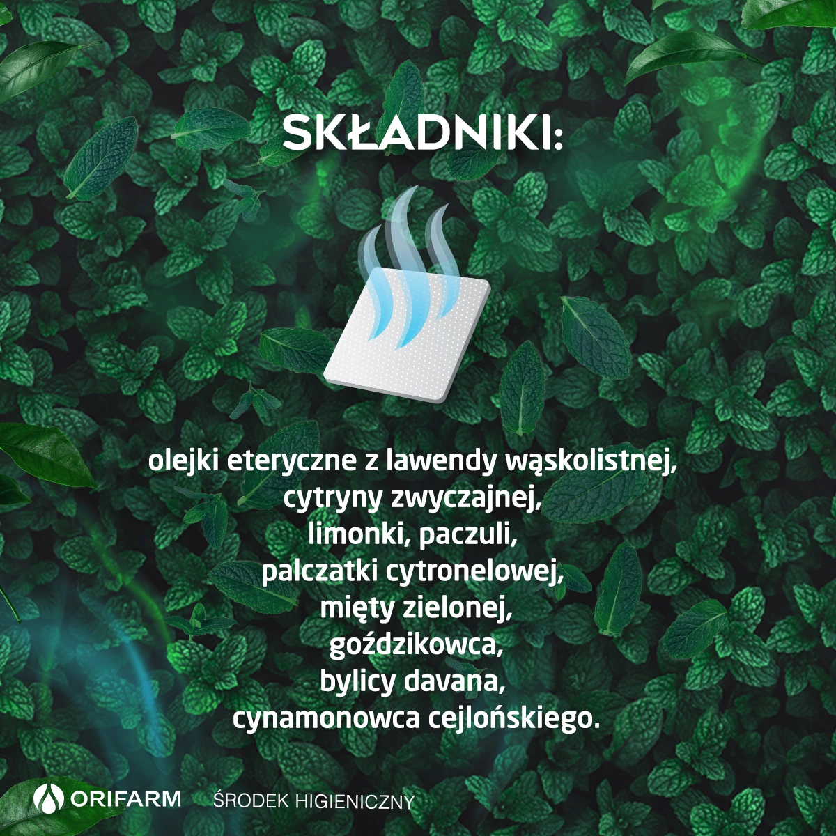 olejki eteryczne z lawendy wąskolistnej, cytryny zwyczajnej, limonki, paczuli, palczatki cytronelowej, mięty zielonej, goździkowca, bylicy davana, cynamonowca cejlońskiego