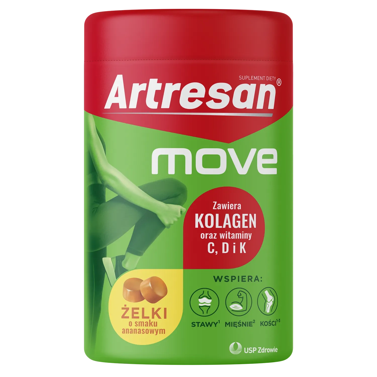 - Artresan® move – żelki o smaku ananasowym z kolagenem, witaminą C, D i K. Wspierają zdrowie stawów, chrząstki, kości i mięśni.