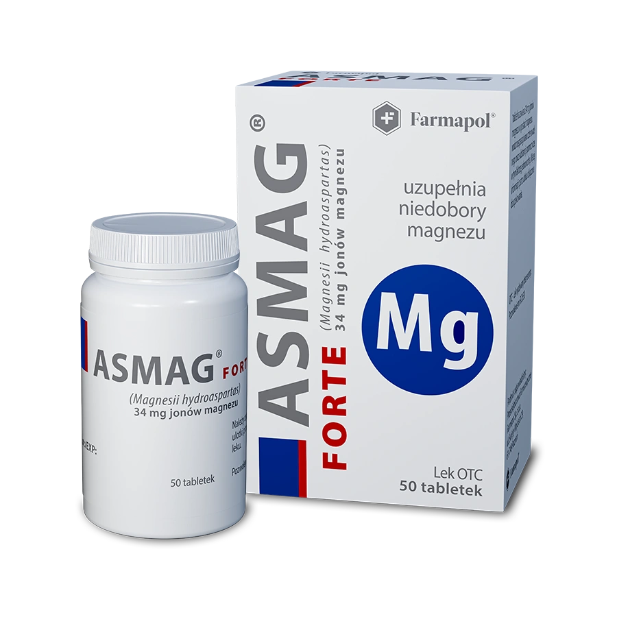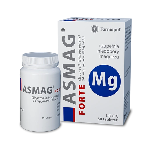 Asmag® Forte to lek w formie tabletek, zawierający 34 mg jonów magnezu w postaci 500 mg magnezu wodoroasparaginianu czterowodnego. Przeznaczony jest dla osób dorosłych i młodzieży powyżej 12. roku życia w celu uzupełnienia niedoborów magnezu.