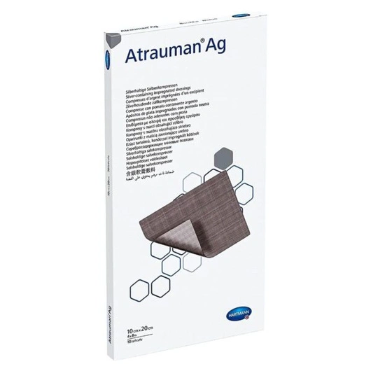 DZIAŁANIE: Antybakteryjny jałowy opatrunek ze srebrem, impregnowany nie zawierającą składników czynnych maścią. Hydrofobowa siatka poliamidowa, z której wykonany jest materiał nośny opatrunku, pokryta jest srebrem metalicznym. Pod wpływem wydzieliny z rany, z opatrunku uwalniają się jony srebra o bakteriobójczym działaniu. Atrauman Ag zwalcza zarówno bakterie gram-ujemne jak i gram-dodatnie, włącznie ze szczepami MRSA. Stężenie uwalnianych jonów srebra gwarantuje niską cytotoksyczność opatrunku. Maść pielęgnuje brzegi rany, zapewnia ich elastyczność, zapobiega przyklejaniu się opatrunku do rany, dzięki czemu jego zmiany przebiegają bezboleśnie. Wydzielina wraz z martwymi bakteriami nie jest zatrzymywana w strukturze opatrunku, lecz zostaje przepuszczona do wtórnego opatrunku chłonnego. Sterylny, pakowany pojedynczo. Rozmiar: 10 cm x 20 cm.