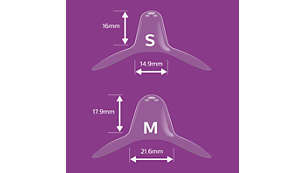 Obróć osłonkę w prawo i wprowadź sutek do tunelu. Następnie rozciągnij podstawę osłonki wokół otoczki brodawki. Jeśli pomiędzy brodawką a silikonem została 2-milimetrowa przerwa, osłonka jest odpowiednio dopasowana. Wskazówka: rozmiar dotyczy brodawki sutkowej, a nie otoczki. Nie wiesz, który rozmiar wybrać? Skontaktuj się z lekarzem, aby uzyskać pomoc.