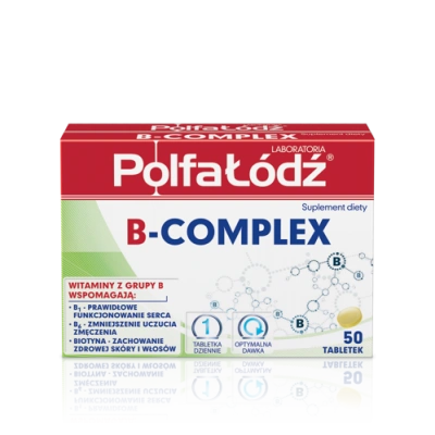 Suplement diety stanowi uzupełniający codzienną w dietę w witaminy z grupy B. Produkt przeznaczony dla dorosłych i młodzieży. Składniki substancja wypełniające: fosforany wapnia, celuloza; amid kwasu nikotynowego, D-pantotenian wapnia, maltodekstryna, D-biotyna, kwas pteroilomonoglutaminowy, stabilizator: poliwinylopolipirolidon, cynajkobalamina, chlorowodorek pirydoksyny, ryboflawina, monoazotan tiaminy, substancja przeciwzbrylająca; sole magnezowe kwasów tłuszczowych, dwutlenek krzemu.