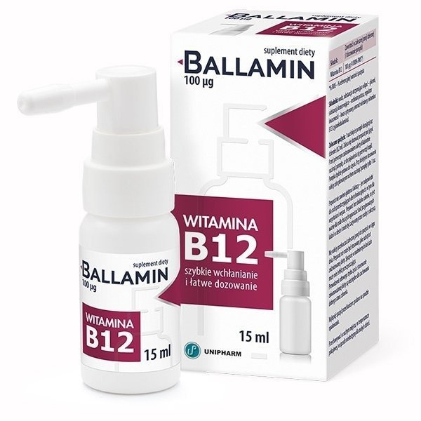 Suplement diety Ballamin o przyjemnym wiśniowym smaku w postaci sprayu do aplikacji pod język jest bogaty w witaminę B12, która wspiera prawidłowe funkcjonowanie organizmu człowieka poprzez udział w prawidłowym funkcjonowaniu układu odpornościowego, układu nerwowego, metabolizmu energetycznego oraz wspomaganiu prawidłowej produkcji czerwonych krwinek, zmniejszenia uczucia zmęczenia i znużenia, procesu podziału komórek, prawidłowych funkcji psychologicznych. Forma dozowania powoduje, że produkt jest łatwy w użyciu i szybciej się wchłania. Suplement diety nie zawiera cukru, glutenu i laktozy.