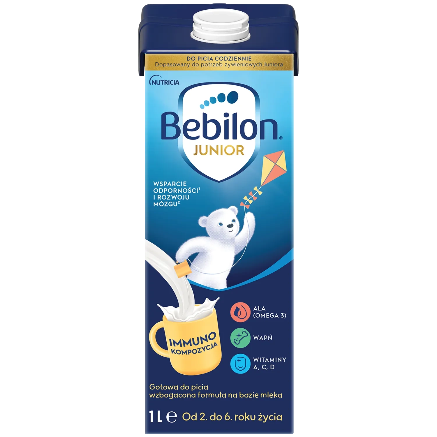 • Gotowy do picia napój mleczny Bebilon Junior (1 l) dla dzieci 2–6 lat. Zawiera witaminy A, C, D, wapń, żelazo, jod i kwas ALA, wspiera odporność, rozwój kości i funkcje poznawcze.