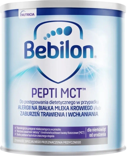 Bebilon Pepti MCT to żywność specjalnego przeznaczenia medycznego przeznaczona do postępowania dietetycznego w alergii na białka mleka krowiego i/lub zaburzeniach trawienia i wchłaniania. Formuła oparta na białkach serwatkowych poddanych hydrolizie znacznego stopnia (eHF), z obniżoną zawartością laktozy oraz dodatkiem średniołańcuchowych triglicerydów (MCT), pomaga łatwiej przyswajać tłuszcze i białko. Zawiera m.in. DHA, AA i nukleotydy. Może być stosowana od pierwszych dni życia – zawsze pod nadzorem lekarza.
