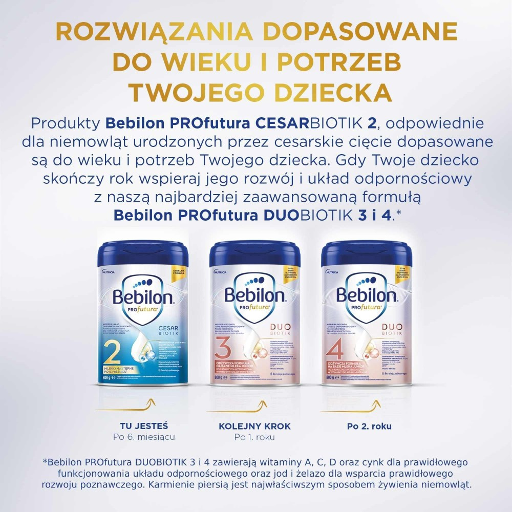 - Bebilon PROfutura CESARBIOTIK 2 to mleko modyfikowane przeznaczone dla niemowląt powyżej 6. miesiąca życia. Produkt wspiera rozwój dziecka, zawierając unikalną formułę z prebiotykami, które pomagają w utrzymaniu równowagi mikroflory jelitowej.