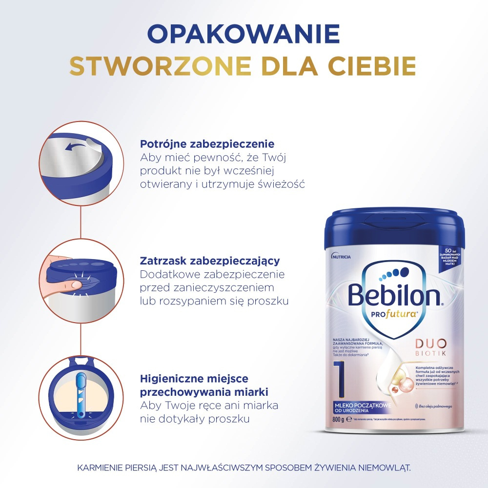 - Mleko dla dzieci Bebilon Profutura DUOBIOTIK 1 w nowym opakowaniu. Bebilon Profutura 1 jest odpowiedni dla niemowląt od urodzenia, jeśli nie są one karmione piersią.