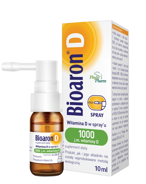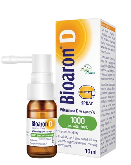 BIOARON D 1000 j.m. to suplement diety w formie sprayu, przeznaczony do codziennego uzupełniania diety w witaminę D. Preparat jest odpowiedni dla dzieci powyżej 4. roku życia, młodzieży oraz dorosłych, a dzięki formie aplikatora umożliwia łatwe i precyzyjne podanie odpowiedniej porcji. Witamina D odgrywa ważną rolę w prawidłowym funkcjonowaniu organizmu, m.in. wspiera układ odpornościowy oraz przyczynia się do zachowania zdrowych kości i zębów. Produkt oparty jest na oleju MCT pochodzenia roślinnego, co sprzyja rozpuszczaniu i podawaniu witaminy D rozpuszczalnej w tłuszczach. Preparat polecany jest jako codzienne wsparcie diety szczególnie w okresie ograniczonej ekspozycji na słońce oraz przy zwiększonym zapotrzebowaniu na witaminę D.