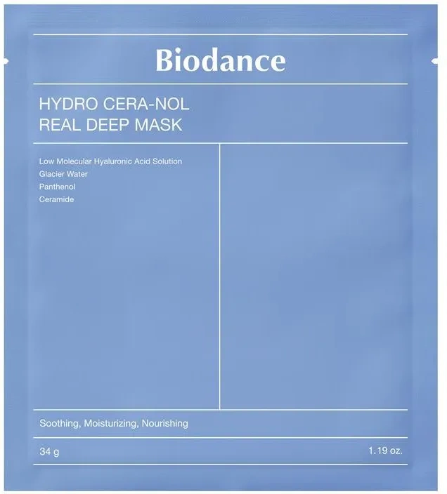 Biodance Hydro Cera-nol Real Deep Mask to innowacyjna hydrożelowa maseczka w płachcie o dwuczęściowej formie (na górną i dolną partię twarzy). Stworzona do stosowania na noc lub przez minimum 3–4 godziny, intensywnie nawilża, koi i poprawia elastyczność skóry. Jej formuła oparta na ceramidach, kwasie hialuronowym i wodzie lodowcowej wzmacnia barierę hydrolipidową, chroni przed utratą wilgoci i przywraca skórze miękkość oraz zdrowy blask.