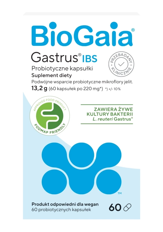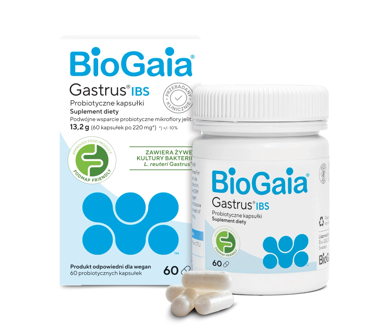 BioGaia Gastrus IBS to suplement diety opracowany specjalnie z myślą o osobach z wrażliwym układem pokarmowym. Zawiera klinicznie przebadane szczepy bakterii probiotycznych Limosilactobacillus reuteri Gastrus® (DSM 17938 i ATCC PTA 6475), które wspierają równowagę mikroflory jelitowej, pomagają utrzymać zdrowie przewodu pokarmowego i wspierają komfort trawienny. Preparat jest wegański, bez laktozy, glutenu, białka mleka i sztucznych dodatków, a jego skuteczność potwierdzono badaniami klinicznymi.