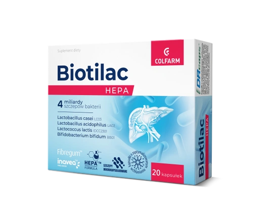 Biotilac Hepa to suplement diety zawierający 4 miliardy żywych kultur bakterii pochodzących z czterech szczepów bakterii oraz Fibregum™ i Inavea™ - rozpuszczalne błonniki pochodzące z akacji. Produkt dla osób dorosłych.