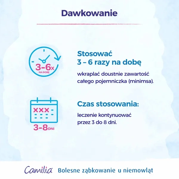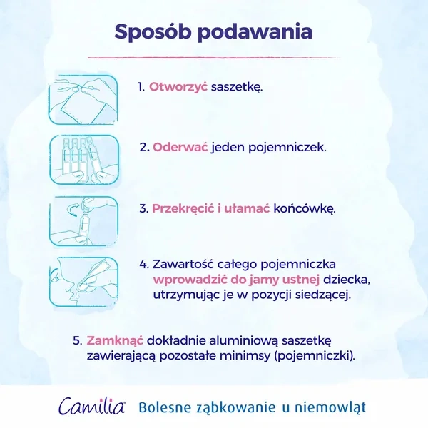 - Naturalny roztwór doustny w higienicznych minimsach, łagodzący ból, obrzęk dziąseł i niepokój towarzyszący ząbkowaniu, bez dodatku lidokainy.