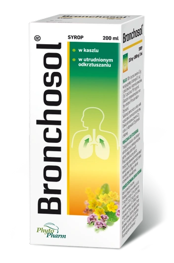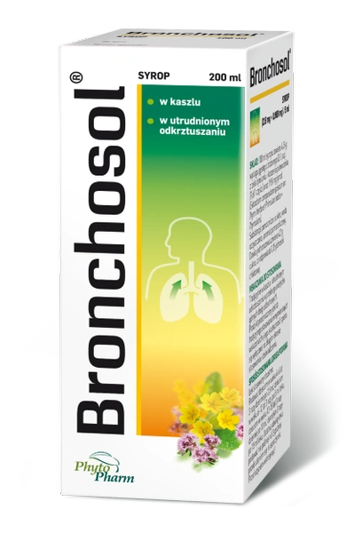 Bronchosol jest produktem leczniczym w postaci syropu stosowanym jako środek wykrztuśny. Zawiera wyciągi z ziela tymianku i korzeni pierwiosnka oraz tymol - substancje pochodzenia roślinne tradycyjnie wykorzystywane w leczeniu mokrego kaszlu.