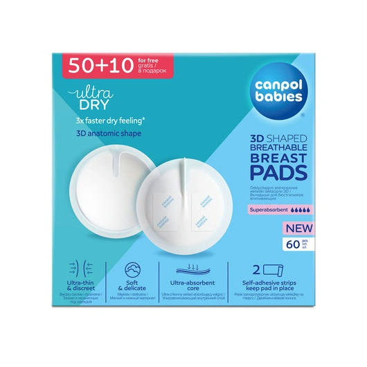 Ultrachłonne wkładki laktacyjne Canpol babies zapewniają ochronę i wyjątkowe 3x szybsze uczucie suchości i świeżości w dzień i w nocy. Są bardzo cienkie, dzięki czemu są dyskretne i niewidoczne pod bielizną i ubraniem. Mają 7 warstw ochronnych, w tym ultrachłonny wkład, który szybko wchłania płyny i zatrzymuje wilgoć wewnątrz wkładki na długi czas. Miękka wierzchnia warstwa jest delikatna dla skóry i przepuszcza powietrze, dzięki czemu pozwala skórze swobodnie oddychać i nie podrażnia wrażliwych piersi. Anatomiczny kształt 3D zwiększa komfort noszenia i sprawia, że wkładka doskonale dopasowuje się do kształtu piersi. Podwójny pasek samoprzylepny utrzymuje wkładkę na miejscu, zapobiegając przesuwaniu się jej wewnątrz biustonosza, dzięki czemu chroni bieliznę i ubranie przed zabrudzeniem, zapewniając higienę i komfort użytkowania. Wkładki laktacyjne Canpol babies nie rozwarstwiają się po wypełnieniu płynem i zachowują swój pierwotny kształt. Każda wkładka jest zapakowana osobno dla zapewnienia maksymalnej higieny.