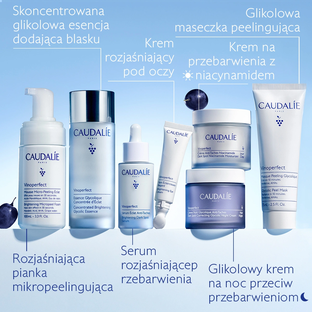Caudalie Vinoperfect Glikolowy Krem na Noc na PrzebarwieniaWkład to skuteczna i ekologiczna odpowiedź na problem przebarwień, nierównomiernego kolorytu i szorstkiej struktury skóry. Wzbogacony o opatentowaną winiferynę (pozyskiwaną z winorośli), delikatnie złuszczający kwas glikolowy i enzym z papai, krem działa jak łagodny peeling, który stopniowo wyrównuje koloryt i poprawia teksturę cery. Receptura została udoskonalona – jest teraz bardziej komfortowa w stosowaniu: lżejsza, nietłusta i odpowiednia nawet dla skóry wrażliwej.