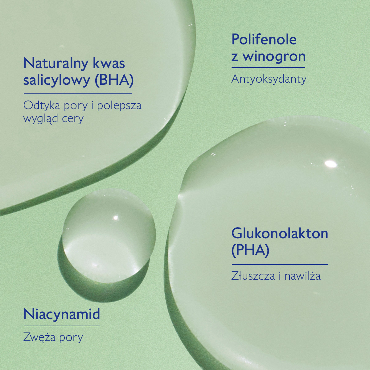 zmniejsza wypryski, zaskórniki i widoczność porów