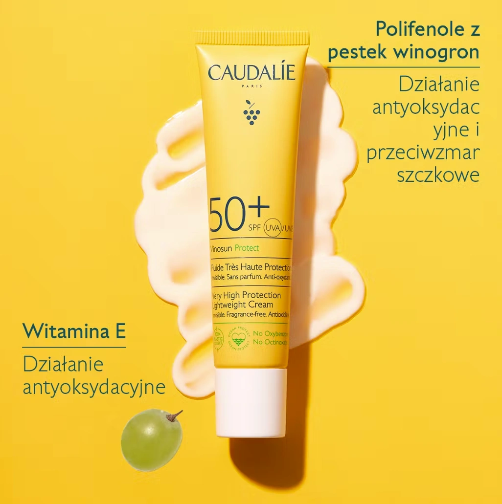 Caudalie Vinosun Protect Fluid SPF50+ to codzienna tarcza przeciw promieniowaniu UVA/UVB dla skóry twarzy i szyi. Dzięki ultralekkiej, płynnej konsystencji nie pozostawia śladów i nie obciąża skóry, dlatego idealnie sprawdzi się także pod makijaż. Bezzapachowa, wegańska formuła bogata w naturalne przeciwutleniacze – świerk, polifenole z pestek winogron i witaminę E – neutralizuje wolne rodniki i wspiera ochronę komórkową. Odpowiednia również dla kobiet w ciąży i karmiących piersią.