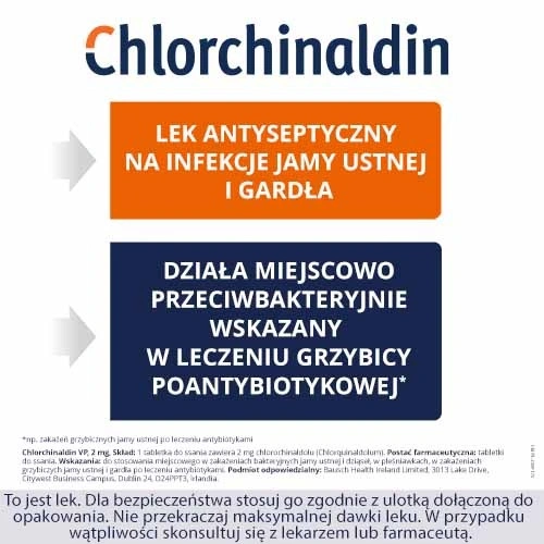 Chlorchinaldin VP, 2 mg, tabletki do ssania to lek o miejscowym działaniu przeciwbakteryjnym, przeciwgrzybiczym i przeciwpierwotniakowym, przeznaczony do stosowania w jamie ustnej i gardle. Substancja czynna – chlorochinaldol – pomaga zwalczać drobnoustroje odpowiedzialne za ból, pieczenie, naloty czy stan zapalny śluzówki. Sprawdza się m.in. przy bakteryjnych zakażeniach jamy ustnej i dziąseł, pleśniawkach oraz kandydozie po antybiotykoterapii. Wygodna forma tabletek do ssania pozwala na stopniowe uwalnianie substancji czynnej dokładnie w miejscu problemu, co jest szczególnie korzystne przy nawracających dolegliwościach gardła i jamy ustnej.
