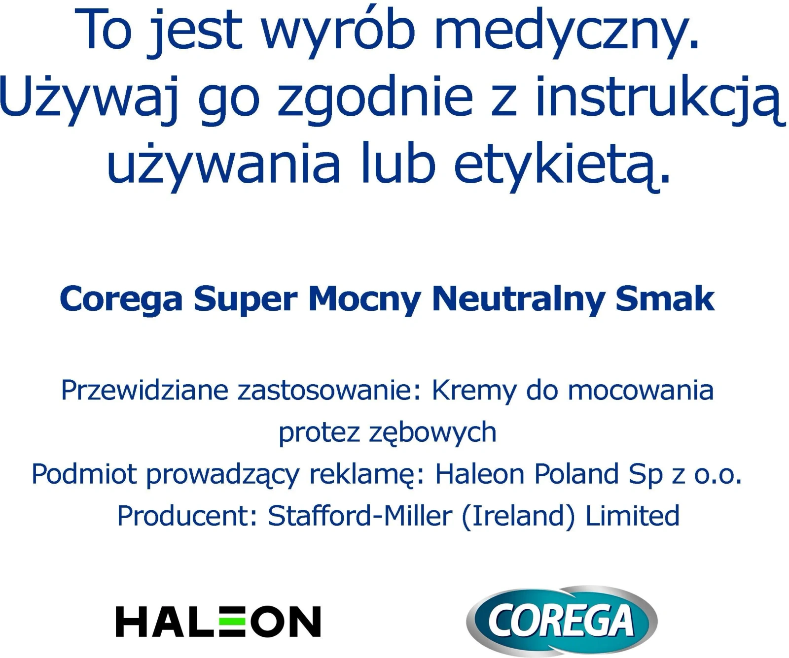 Corega Super Mocny Neutralny Smak należy do gamy kremów mocujących do protez Corega. Nie zawiera dodatku aromatów i barwników. Specjalna formuła produktu zapewnia trwałe mocowanie protezy przez cały dzień oraz wyróżnia się neutralnym smakiem, który nie koliduje z aromatami spożywanych pokarmów. Krem nie zawiera cynku.