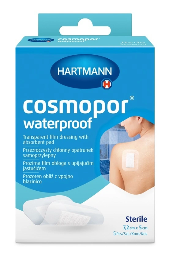 • Cosmopor waterproof jest jałowym, wodoodpornym, samoprzylepnym opatrunkiem z warstwą chłonną. Jest wykonany z półprzepuszczalnej folii poliuretanowej, która zapewnia swobodne przenikanie pary wodnej i gazów, ale stanowi barierę dla wody i bakterii.