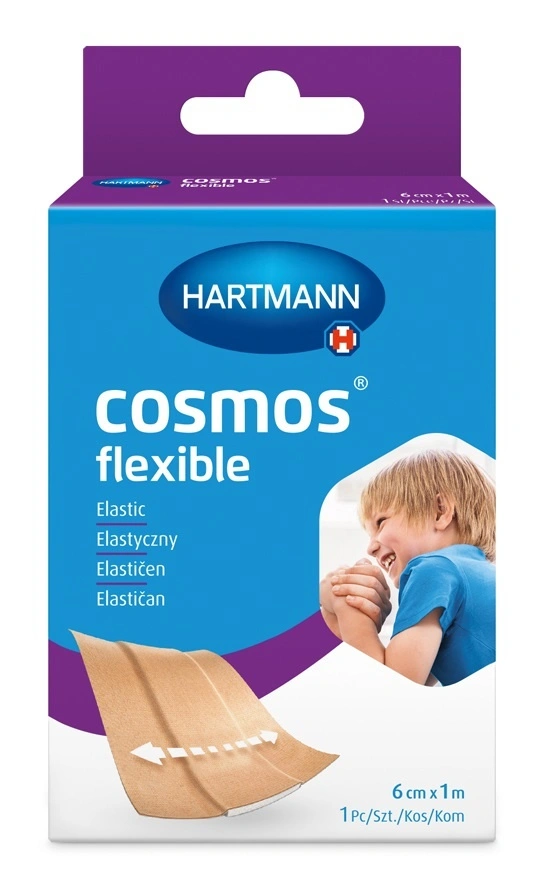 Wyrób medyczny Cosmos Flexible to plaster do cięcia o wymiarach 1 m x 6 cm, który zabezpiecza drobne rany i skaleczenia, w szczególności te powstałe na kolanach i łokciach.