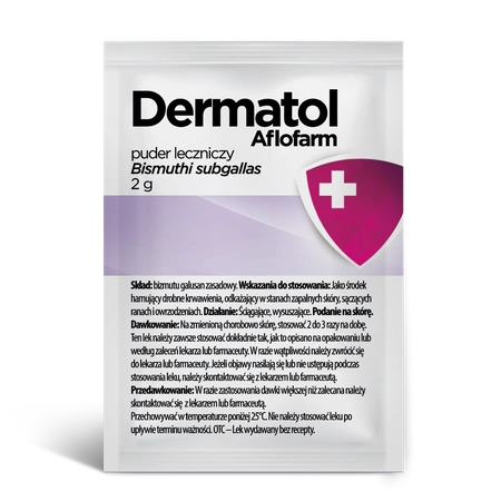 Dermatol Aflofarm to puder leczniczy z bizmutu galusanem zasadowym, który działa ściągająco, wysuszająco i odkażająco. Wspomaga gojenie się ran, ogranicza sączenie i łagodzi stany zapalne skóry. Doskonale sprawdzi się przy drobnych urazach, otarciach, owrzodzeniach i ranach sączących. Dzięki wygodnej postaci pudru jest prosty w aplikacji i szybko przynosi ulgę w podrażnieniach skóry, stanowiąc praktyczne wyposażenie każdej domowej apteczki.
