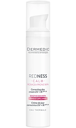 - Dermedic Redness Calm, krem korygujący UV+ IR został stworzony do dziennej pielęgnacji skóry w początkowym stadium trądziku różowatego oraz do cery naczynkowej i nadreaktywnej.
