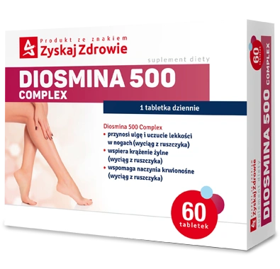 - Diosmina 500 Complex marki Zyskaj Zdrowie to codzienne wsparcie krążenia żylnego oraz profilaktyka dolegliwości kończyn dolnych, tj. uczucie ciężkości, obrzęki, ból, "zimne stopy".