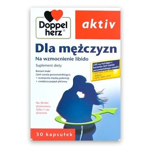 - DOPPELHERZ AKTIV Dla mężczyzn to suplement diety z ekstraktem z maki i żeń-szenia koreańskiego, wspierający witalność i kondycję. Pomaga w utrzymaniu sprawności fizycznej oraz psychicznej.