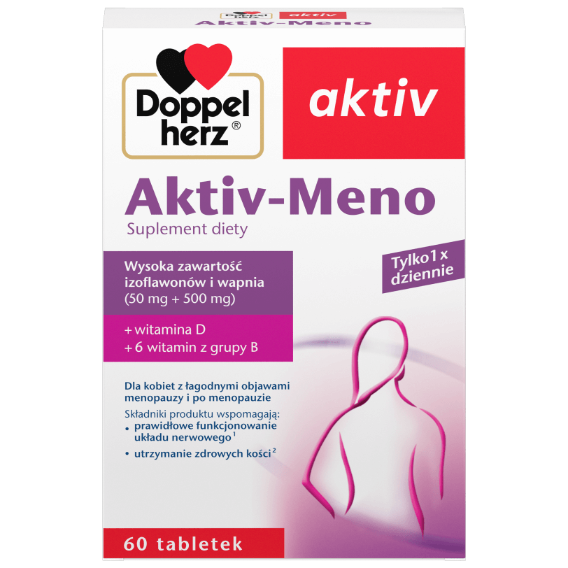 Doppelherz® aktiv Aktiv-Meno to suplement diety opracowany z myślą o kobietach dojrzałych, które chcą uzupełnić codzienną dietę w składniki wspierające organizm w czasie zmian związanych z menopauzą oraz po jej zakończeniu. Produkt łączy izoflawony sojowe z wapniem, witaminą D oraz witaminami z grupy B, tworząc kompozycję wspierającą dobry nastrój, koncentrację, a także prawidłowe funkcjonowanie kości i układu nerwowego. To wygodne rozwiązanie dla kobiet, które chcą zadbać o siebie w naturalny i codzienny sposób, jako uzupełnienie zbilansowanej diety i zdrowego trybu życia.