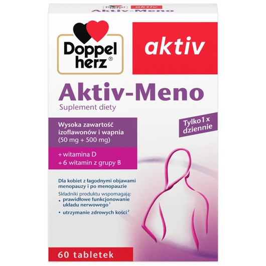 Doppelherz® aktiv Aktiv-Meno to suplement diety opracowany z myślą o kobietach dojrzałych, które chcą uzupełnić codzienną dietę w składniki wspierające organizm w czasie zmian związanych z menopauzą oraz po jej zakończeniu. Produkt łączy izoflawony sojowe z wapniem, witaminą D oraz witaminami z grupy B, tworząc kompozycję wspierającą dobry nastrój, koncentrację, a także prawidłowe funkcjonowanie kości i układu nerwowego. To wygodne rozwiązanie dla kobiet, które chcą zadbać o siebie w naturalny i codzienny sposób, jako uzupełnienie zbilansowanej diety i zdrowego trybu życia.