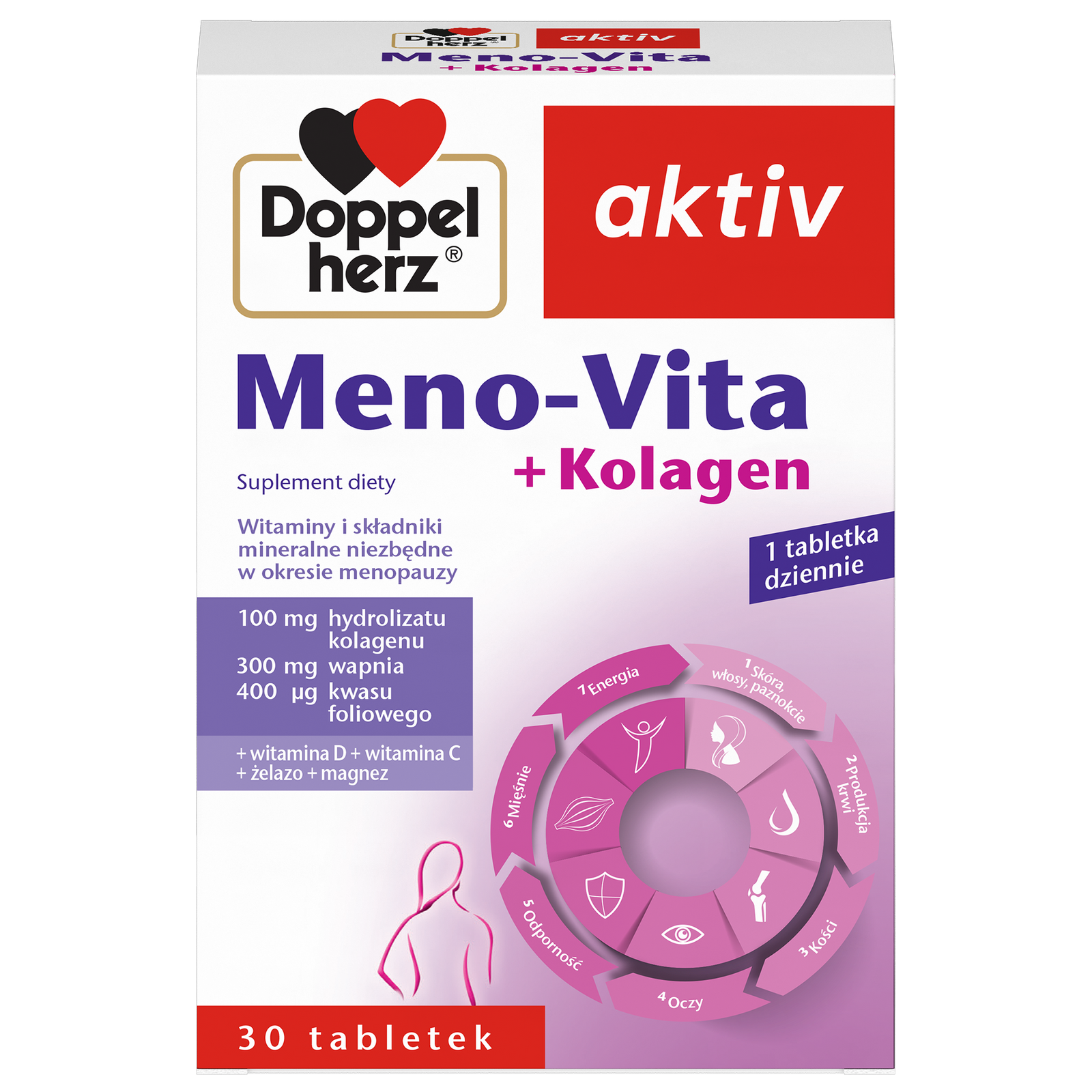 Doppelherz® aktiv Meno-Vita to starannie opracowany suplement diety przeznaczony dla kobiet przechodzących przez naturalny etap zmian hormonalnych. Formuła łączy osiem składników aktywnych – w tym witaminy, minerały oraz hydrolizat kolagenu – które pomagają uzupełnić codzienną dietę w okresie menopauzy. Produkt powstał z myślą o kobietach chcących zadbać o prawidłowe funkcjonowanie organizmu, wsparcie kości, skóry, włosów oraz poziomu energii, zgodnie z zatwierdzonymi oświadczeniami zdrowotnymi. Regularna suplementacja może być wartościowym uzupełnieniem zdrowego stylu życia w wymagającym czasie zmian zachodzących w organizmie.