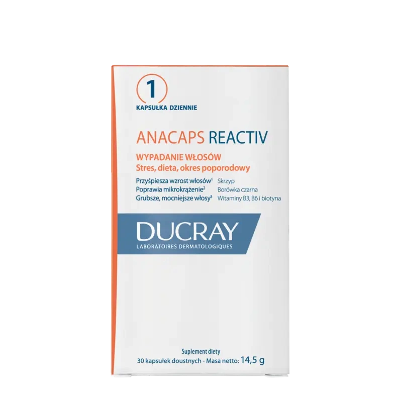 Ducray Anacaps Reactiv to suplement diety przeznaczony dla osób doświadczających okresowego wypadania włosów. Dzięki starannie dobranej formule opartej na aminokwasach siarkowych, witaminach, minerałach i ekstraktach roślinnych, produkt wspomaga zdrowie włosów oraz poprawia ogólną kondycję organizmu. Może być stosowany przez kobiety w ciąży (od 2. trymestru), matki karmiące oraz osoby po leczeniu onkologicznym. Formuła odpowiednia dla wegan.