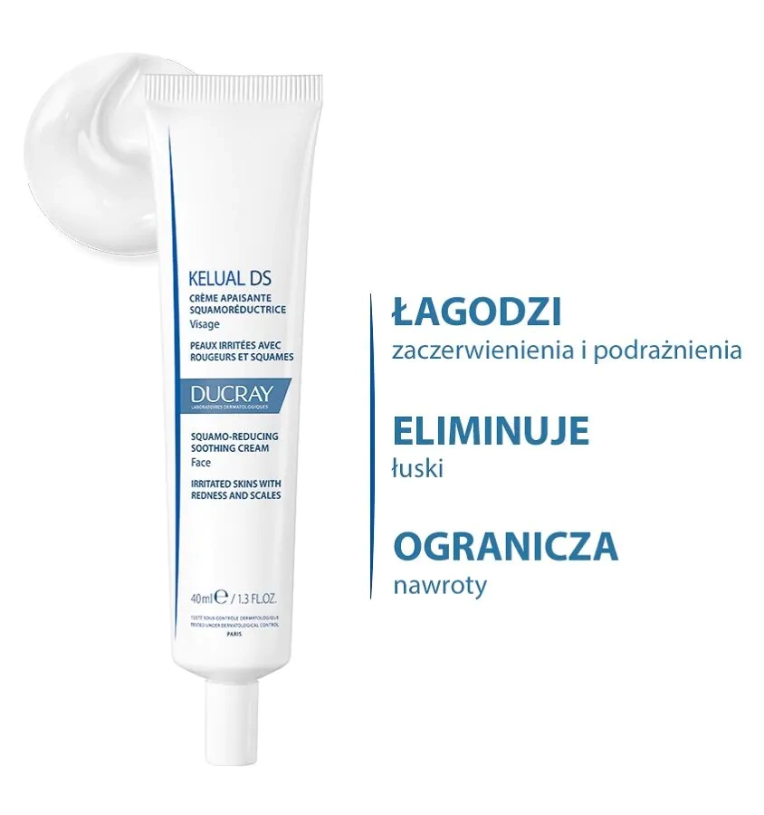 - Kojący krem Ducray Kelual DS w przypadku podrażnionej i łojotokowej skóry twarzy.