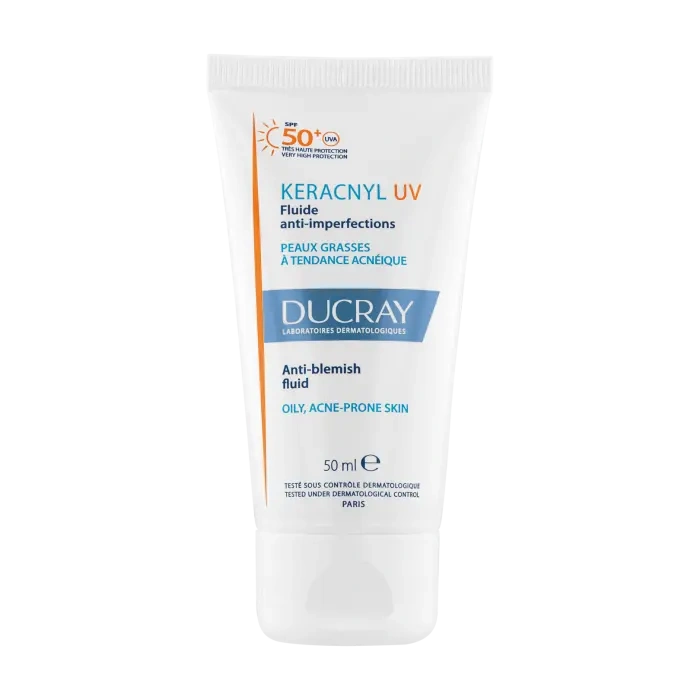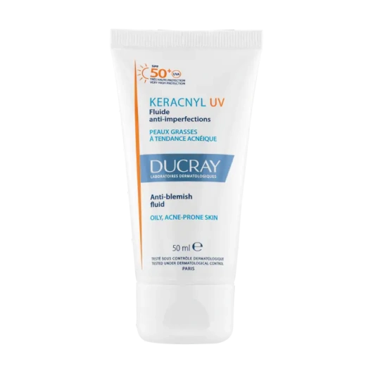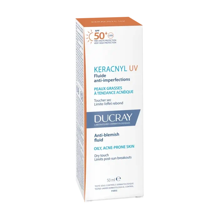 - Fluid przeciw niedoskonałościom KERACNYL UV to preparat 2 w 1 z filtrem SPF 50+, przeciwdziałający niedoskonałościom, chroniący skórę i zapobiegający efektowi „odbicia”* na skórze skłonnej do trądziku wystawionej na działanie promieni słonecznych.