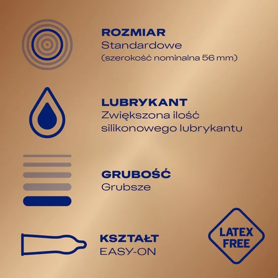 Dzięki kształtowi Easy-On łatwo się zakładają, posiadają gładką powierzchnię, a zakończenie ze zbiorniczkiem zapewnia dodatkowe bezpieczeństwo podczas stosunku. Standardowa szerokość nominalna 56 mm sprawia, że pasują do większości mężczyzn.