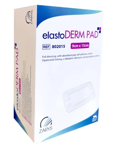 elastoDERM PAD 9 x 15 cm to jałowy, samoprzylepny opatrunek foliowy z wkładem chłonnym, przeznaczony do zabezpieczania większych, niezakażonych i niepowikłanych ran pooperacyjnych. Wykonany z cienkiej, elastycznej folii poliuretanowej, skutecznie chroni ranę przed drobnoustrojami i wilgocią, jednocześnie umożliwiając jej stałą obserwację bez konieczności zdejmowania opatrunku. Paroprzepuszczalna struktura sprzyja prawidłowej wymianie gazowej, zapobiegając maceracji skóry. Centralny wkład chłonny absorbuje niewielki wysięk, a trójstopniowy system aplikacji zapewnia szybkie, precyzyjne i bezpieczne założenie.