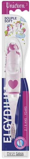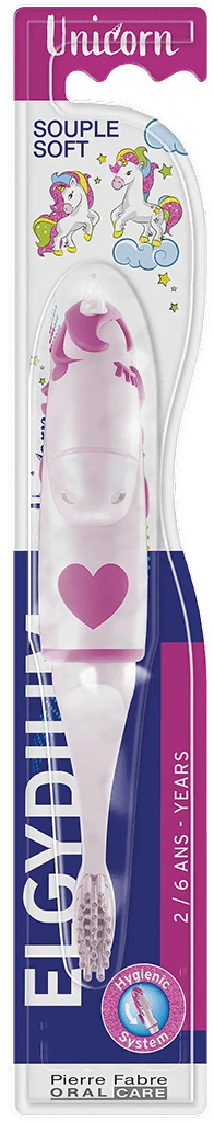 Szczoteczka do zębów ELGYDIUM UNICORN przeznaczona jest dla dzieci w wieku od 2 do 6 lat. Idealna do przedszkola i szkoły gdzie nie należy rezygnować z regularnego utrzymywania dobrej higieny jamy ustnej. Zdejmowana osłona główki szczoteczki pełni jednocześnie rolę etui jak i również chroni przed drobnoustrojami. Zabawny design, miękkie włosie i ergonomiczny uchwyt zapewniają skuteczne i przyjemne szczotkowanie.